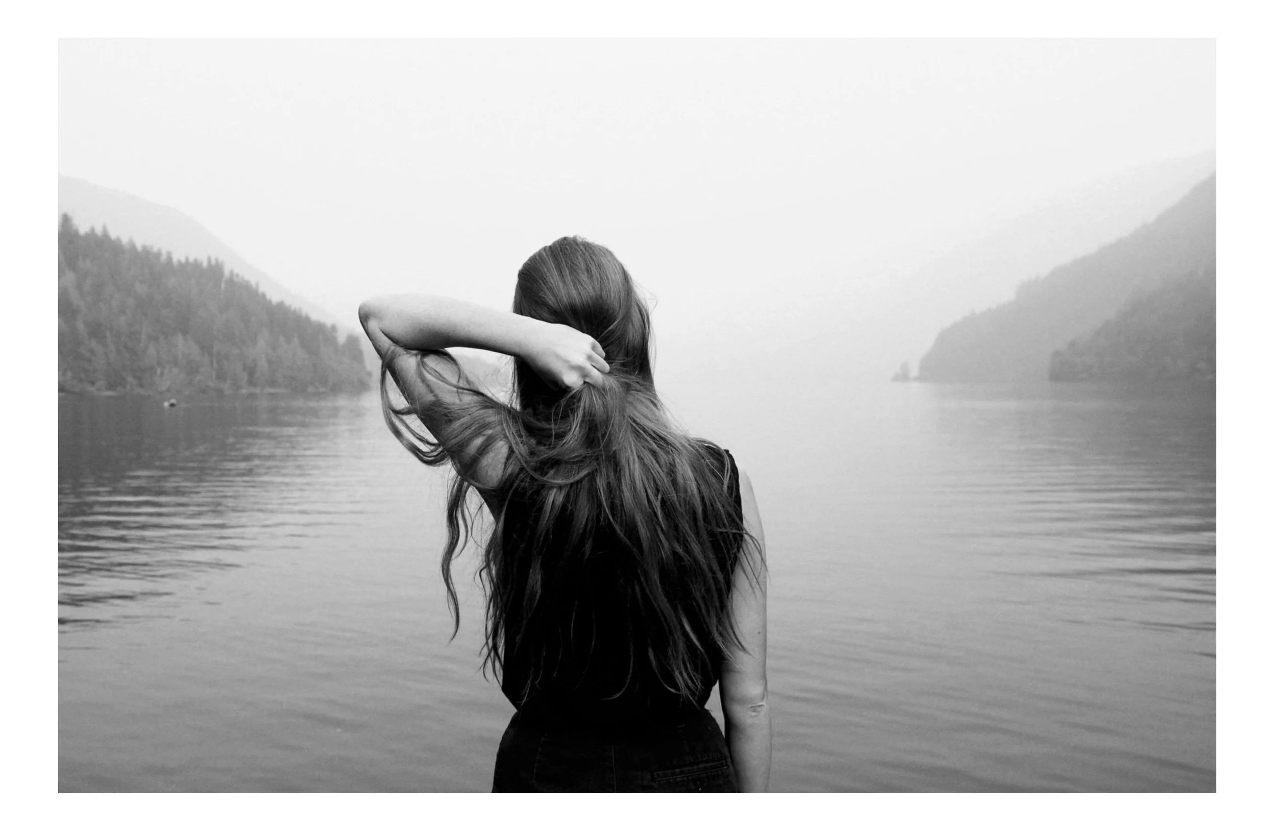 Collection of black and white and color photos of a woman with straight long hair, wearing casual clothing, including a leather jacket and jeans, with an outdoor background.